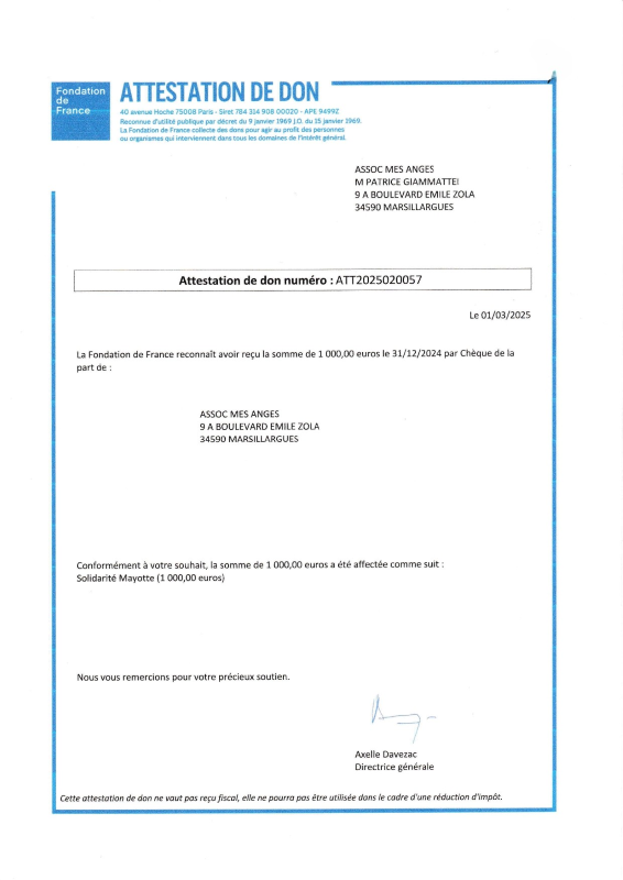 Més-Anges a fait un don de 1 000 € à la Fondation de France dans le cadre de son action « Solidarité Mayotte » pour venir en aide aux enfants victimes du cyclone qui a ravagé l’archipel le 14 décembre 2024.